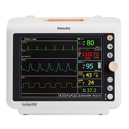 Philips SureSigns VM8 es un monitor de signos vitales multiparamétrico diseñado para su uso con pacientes adultos, pediátricos y neonatales. El diseño duradero del monitor, el asa de transporte integrada y la interfaz fácil de usar permiten a los médicos realizar una monitorización eficaz del paciente en una variedad de entornos de atención.
