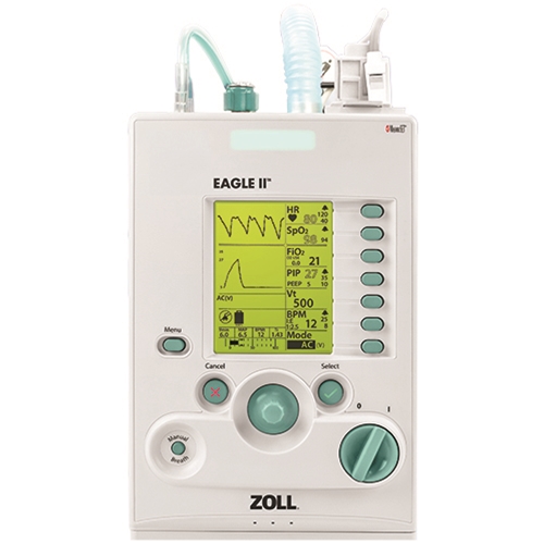 El ventilador portátil Zoll Eagle II es la solución ideal para las UCI, los servicios de urgencias y el transporte intrahospitalario de lactantes (≥5 kg), pacientes pediátricos y adultos. Con un peso inferior a 3,5 kg, se puede montar en la pared o en un soporte rodante o en la cama. Además del modo AC, el Eagle II ofrece los modos SIMV y CPAP (NPPV/PPV) con soporte de presión.